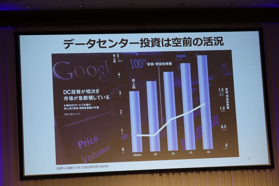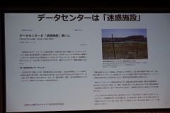 田中氏は、続けてデータセンターへの投資が集まってくると指摘する。現在は、都心のマンションなど不動産への投資が多いが、ある程度限界が見えているマンションや倉庫の家賃収入から、大きなリターンが見込めるデータセンターへの投資が増えてくると田中氏は分析。米国などでは、電気代が高騰しており、データセンターへの投資が市民生活に影響を与えてくると予想、電力需要の増加を予測して大きな発電所を作るなど、データセンターを分散配置していくべきだと訴えた。
