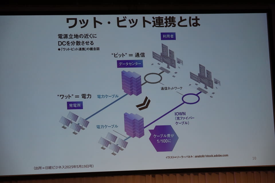 これら電力と通信、データセンターが一体となり、電力と通信インフラを連携させて効率的に社会基盤を構築する取り組み「ワット・ビット連携」が、一部で進められている。
