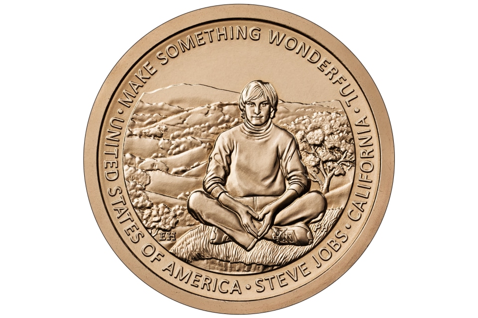 カリフォルニア州の硬貨は、若き日のスティーブ・ジョブズが、オークの木々に覆われた北カリフォルニアの丘陵を背景に座る姿を描く。熟考するような姿勢と表情を通じて、自然から着想を得て複雑なテクノロジーを直感的で有機的なものへと導いたジョブズのビジョンを表現している。碑文には「UNITED STATES OF AMERICA」「CALIFORNIA」「STEVE JOBS」「MAKE SOMETHING WONDERFUL」が刻まれる。