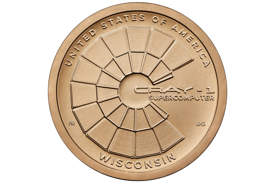 ウィスコンシン州の硬貨は、Cray-1スーパーコンピューターを様式化した俯瞰図で表現。形状のモチーフと「Cray-1」および「コンピューター」の「C」を連想させる構図により、その革新性を象徴している。碑文は「WISCONSIN」「CRAY-1 SUPERCOMPUTER」。