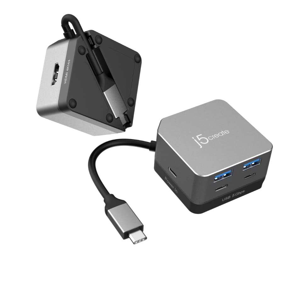 JCD361は、サイコロのような形のUSBハブで、USB Type-C端子1つをHDMI出力(4K 144Hz対応)とUSB端子(Type-C Gen1×2、USB-A Gen1×2)、USB PD充電(100W)端子に拡張できる。デバイスに接続する側のUSB Type-C端子のケーブル長は20cmで、本体背面に収納できるポケットが備えられている。