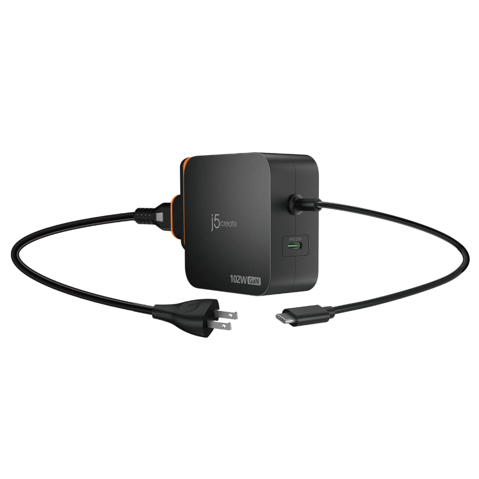 USB-Cケーブル一体型+AC延長キット付・軽量急速PD102W充電器(JUP25100P)は、小型のUSB Type-C充電器。USB Type-C端子を2つ備えており、単独使用で最大100Wと20W、同時利用で合計最大102Wで充電できる。そのうちの1つ(100W)はケーブル(1.8m)一体型で、ケーブルを用意しなくても充電できる。
