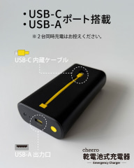 本体にはUSB Type-Cケーブルを内蔵しており、ケーブルを持ち歩く必要がない。さらにUSB Type-Aポートも搭載し、複数の機器を緊急時にすぐ充電できる。