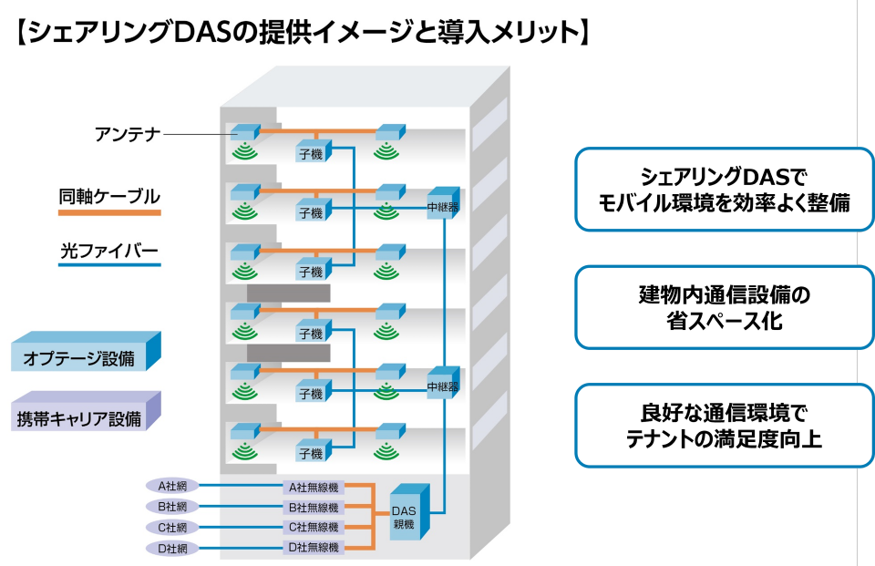 オプテージでは、これまでDASを用いた実証を行っており、今回の取り組みはDASにより施設内のモバイル通信環境を改善する「屋内インフラシェアリングサービス」の第1号案件となる。