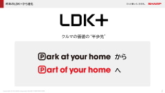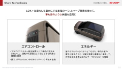 さらに「LDK+は暮らしを豊かにする家電のひとつ。シャープの技術でクルマも家のように快適な空間にしたい」と目指すイメージを示した。LDK+では、機能を追加したプラズマクラスターを搭載するほか、車内で住宅の電気を利用できたり、太陽光発電や蓄電池と連携するV2H機能も備える。