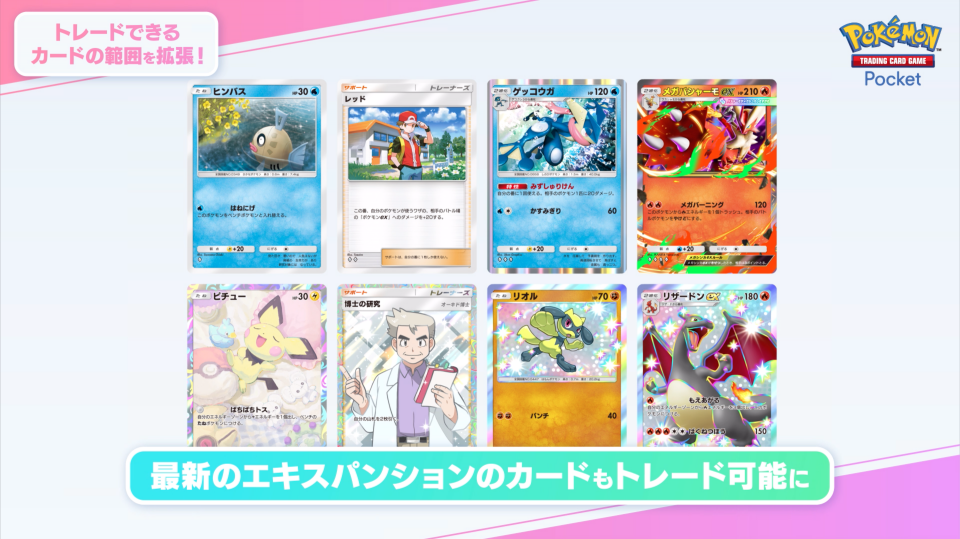 さらに、トレードできるカードの範囲も拡大。最新弾の拡張パックや★2・色違い1~2のカードも交換対象となる。このほか、ゲットチャレンジでは、最新エキスパンション内で未所持のカードが出現しやすくなるほか、表示カードに所持枚数が表示されるようになる。