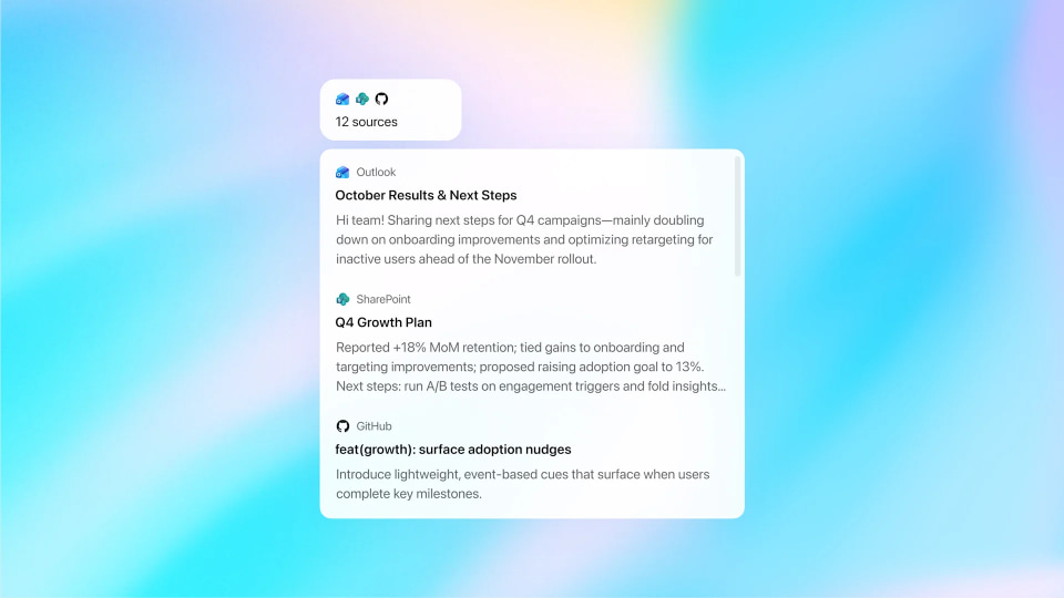 「Company knowledge」は、ChatGPTと企業が利用する各種ツールを連携させる機能。Google DriveやMicrosoft SharePoint、Slackなどのサービスに保存されている社内文書やデータをChatGPTが横断的に参照できる。