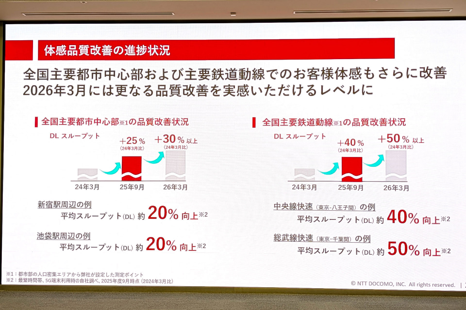 今回の決算説明会で示された資料によれば、2024年度3月と比べ、2025年9月時点では全国で25%の向上を記録し、2026年3月時点で30%以上の向上を目指す。新宿駅や池袋駅の周辺に限ると9月時点で約20%向上したという。