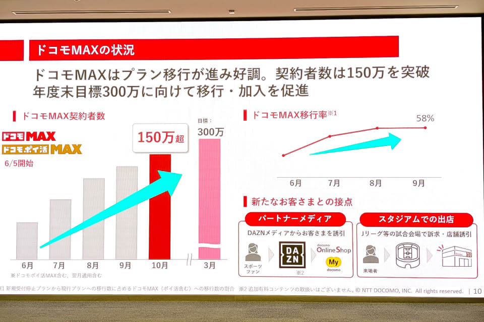 NTTドコモは、4日の決算会見で「ドコモMAX」の契約者数(「ドコモポイ活MAX」を含む)が150万を突破したことを明らかにした。旧プランから「ドコモMAX」への移行率は約6割まで向上した。
