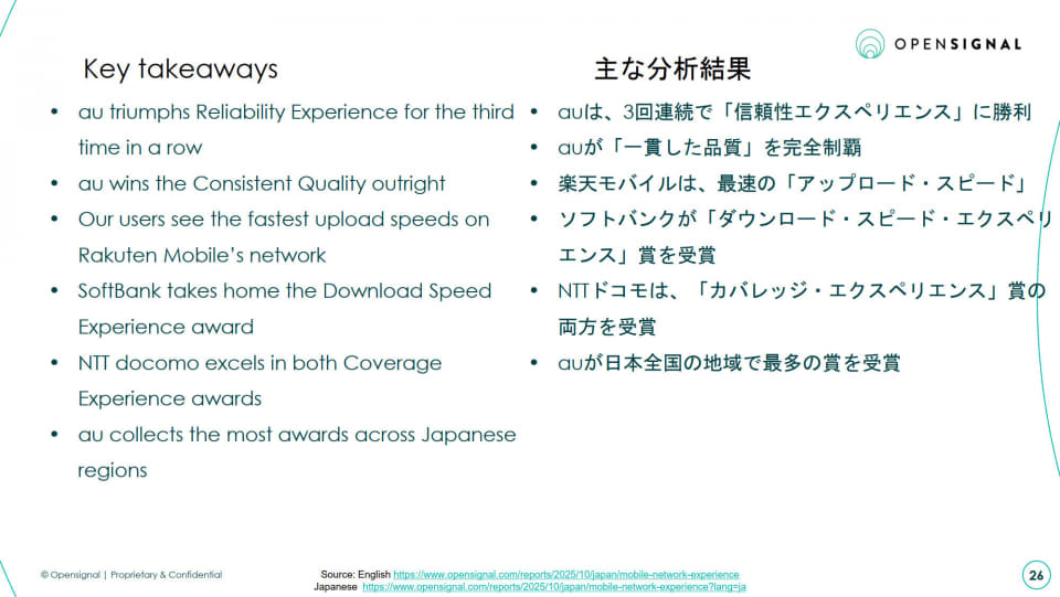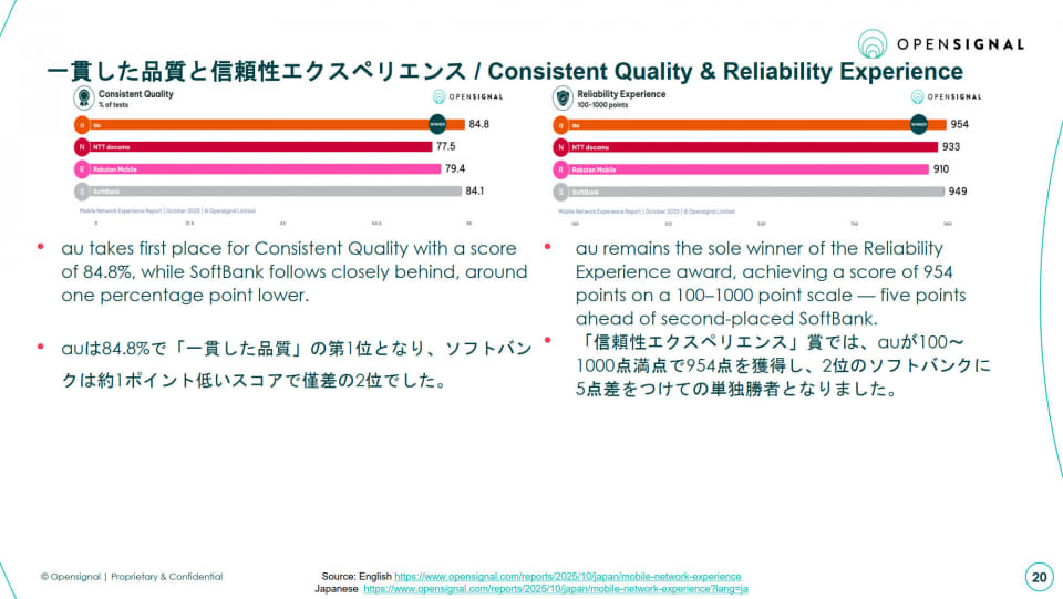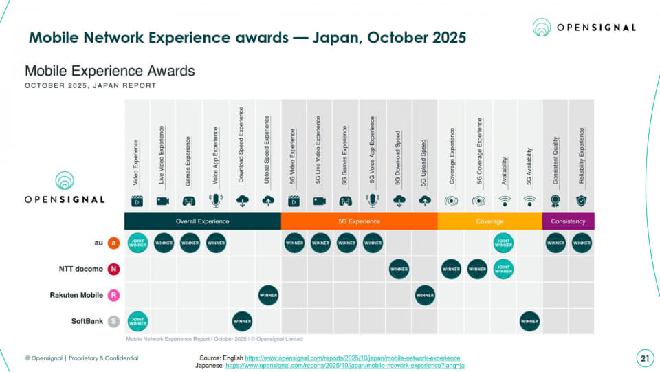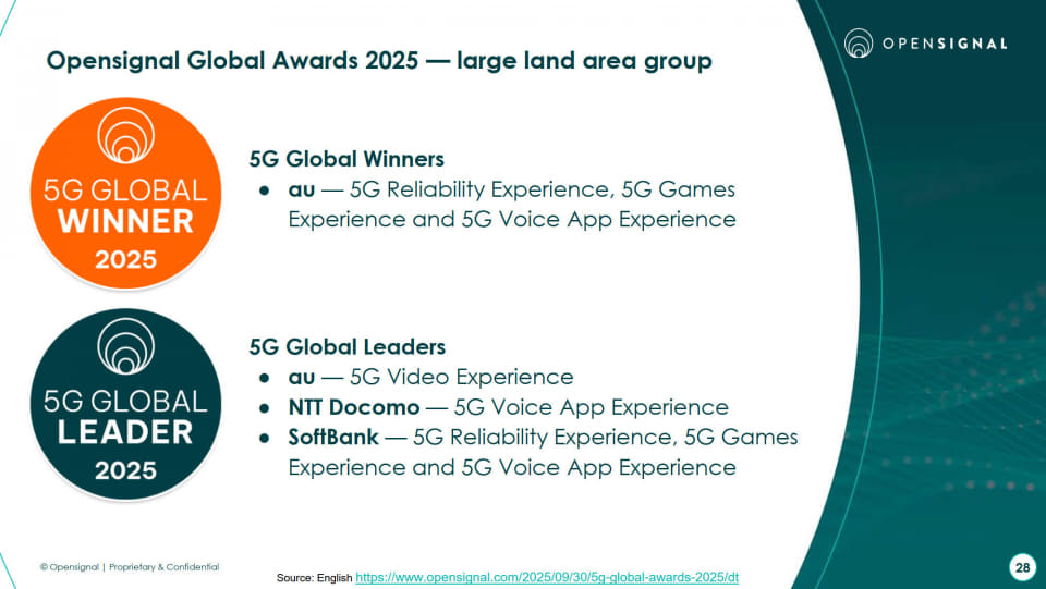 auは、5Gの信頼性、ゲーム、音声アプリ部門でグローバルの勝者となっている。また、ドコモが音声アプリ、auがビデオ、ソフトバンクが信頼性とゲーム、音声アプリ部門で、業界の先頭を行く「グローバルリーダー」の評価を得ている。
