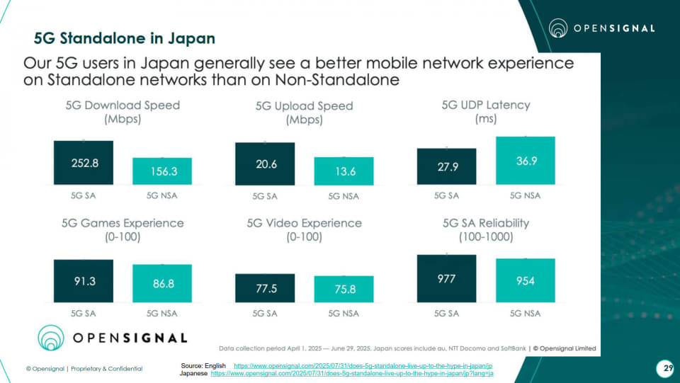 加えて、5G SAの展開にも言及する。auとソフトバンクはドコモと比較して5G SAがより多く利用されていると指摘。5G SAを利用しているデバイスでは、4G接続に戻ることが起きにくく、結果としてより長い時間5G接続が維持できている可能性が高いと話した。