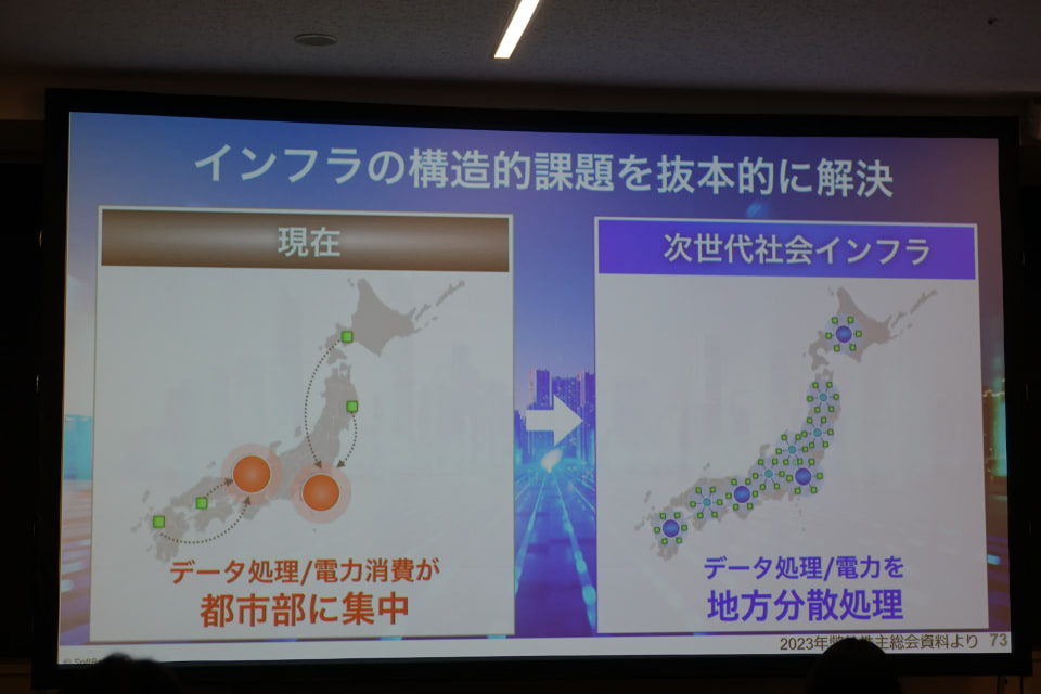 今後はAIがあらゆる場所に浸透し、社会の基盤となっていくと森氏は語る。ソフトバンクでは、これまで東京や大阪といった都市部に集中していたデータ処理や電力負荷を全国へ分散させる「次世代社会インフラ構想」を提唱している。
