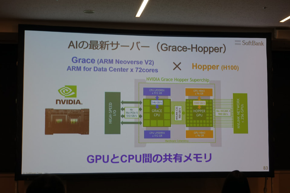 ソフトバンクは、NVIDIAおよびArmと連携し、AI-RANの社会実装を進めている。技術の中核を担うのが「NVIDIA GH200 Grace Hopper」サーバーで、GPUとCPU(Grace)を1枚のチップ上で統合している点が特徴。PCIを介さずに高速通信が可能で、CPU部分にはArmのNeoverseが採用されている。Armの技術によって、GH200は低消費電力でありながら高い処理性能を発揮し、この特性がAI-RANの実現を支える重要な要素となっている。