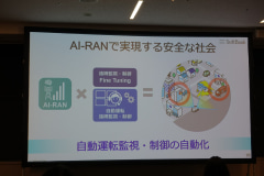 自動運転分野でもAI-RANは重要な役割を果たす。人間の目だけでは膨大な監視作業に対応しきれないため、AIによる判断支援が不可欠となる。AI-RANを活用すれば、自動運転車両が撮影した映像をリアルタイムに解析し、安全性の判断や停止指示などを低遅延で行える。