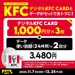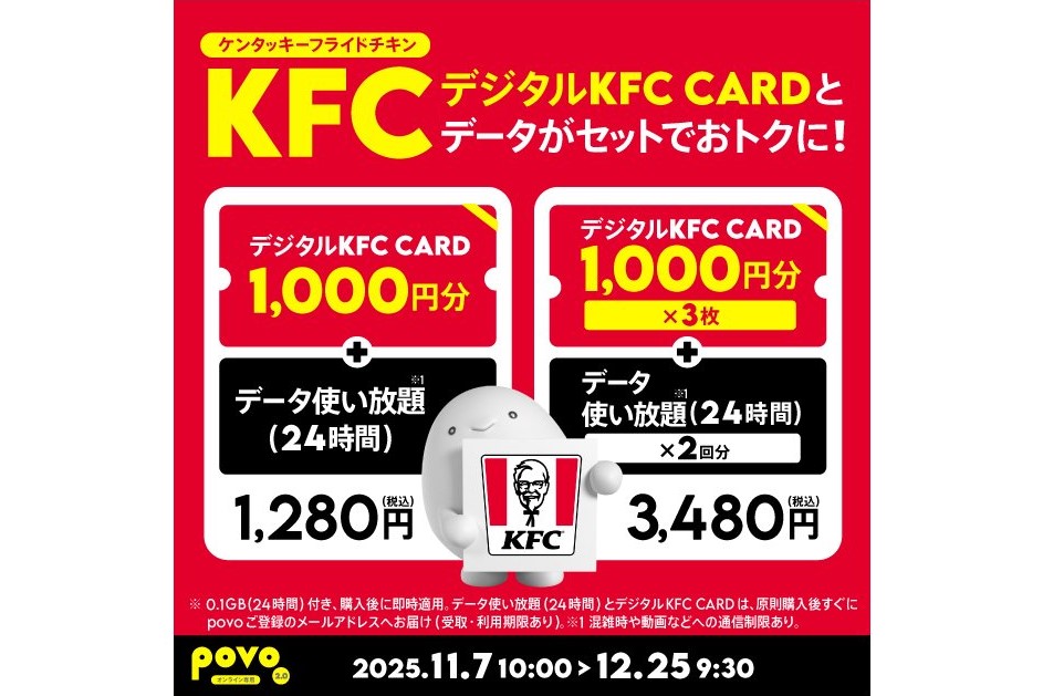 KDDI、沖縄セルラーは、オンライン専用ブランド「povo2.0」で、「ケンタッキーフライドチキンギフト券」と「データ使い放題(24時間)」を組み合わせたコラボトッピングを発売した。期間は12月25日9時30分まで。