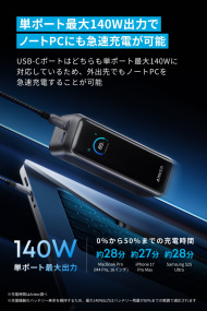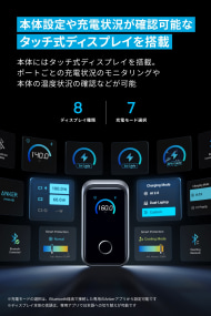 製品本体にディスプレイを搭載し、充電状況や出力情報を確認できるほか、専用アプリから、充電機器に合わせた各ポートの出力調整や本体設定を行うことができる。このほか、USB Type-Cポート2つとUSB Type-Aポート1つなどを備える。大きさは約147×51×44mm、重さは約520g。
