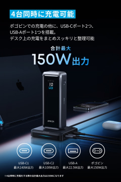 「Anker Prime Charging Base(150W、3 Ports)」は、モバイルバッテリー専用のポゴピンを搭載した急速充電器。置くだけでモバイルバッテリー本体に最大150Wの急速充電が可能とうたう。価格は1万2990円、順次販売開始となる。