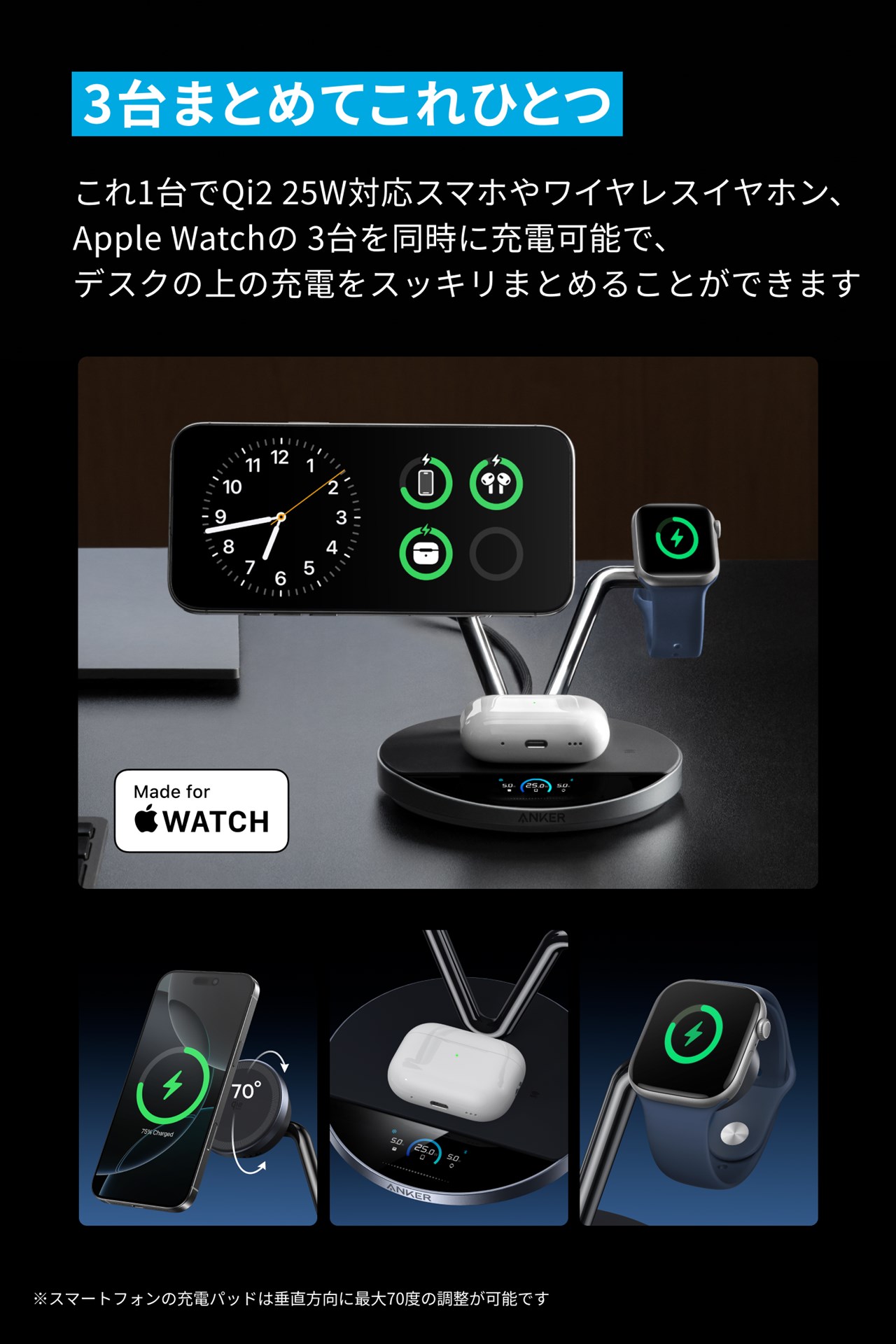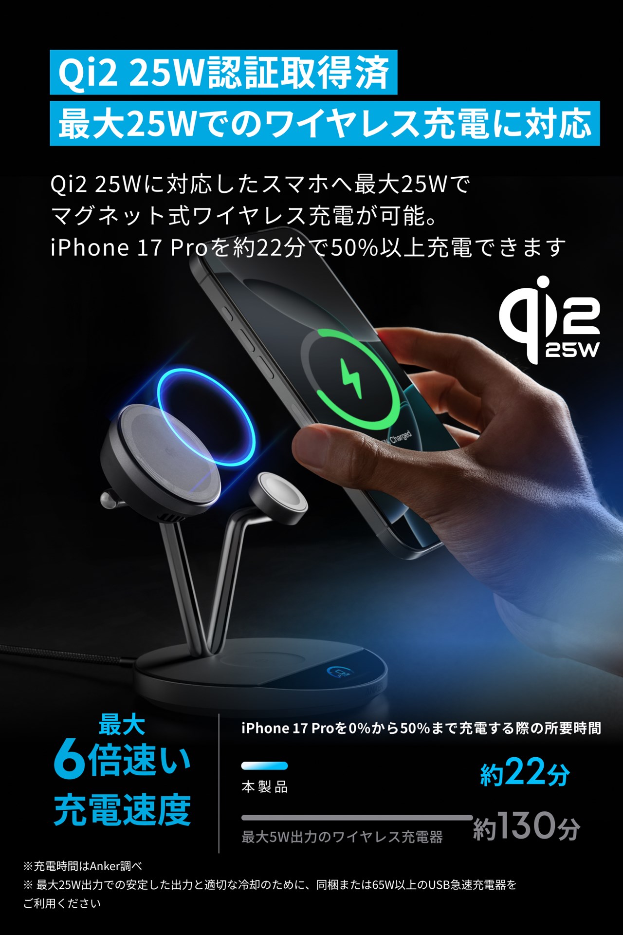 マグネット式ワイヤレス充電で最大25W、Apple Watch用ワイヤレス充電で最大5W、ワイヤレス充電で最大5W出力となる。なお、新規格Qi2 25W出力は、25W出力に対応したスマートフォンおよび専用ケース装着時にのみ対応する。大きさは約169×138×125mm、重さは約620g。
