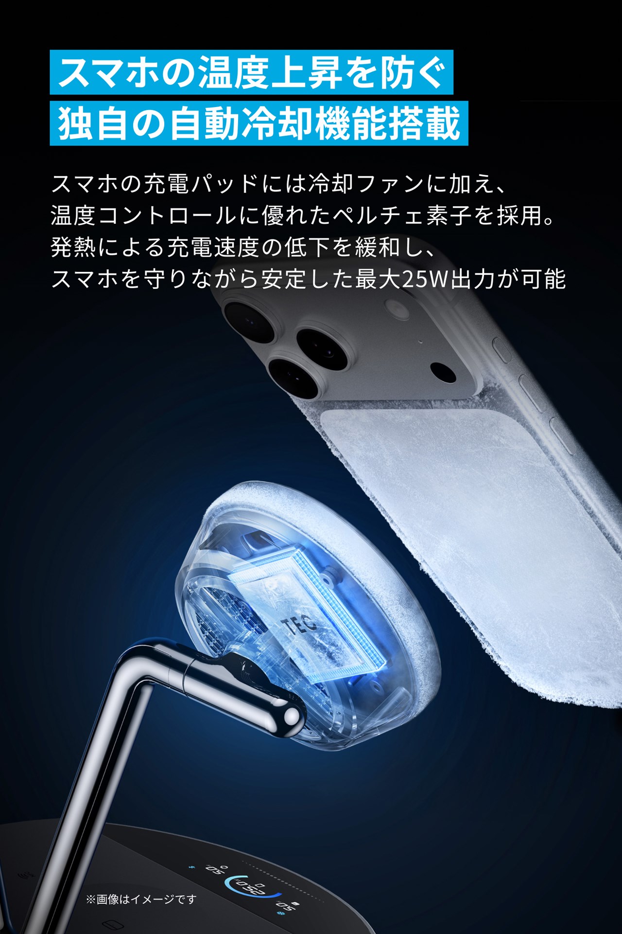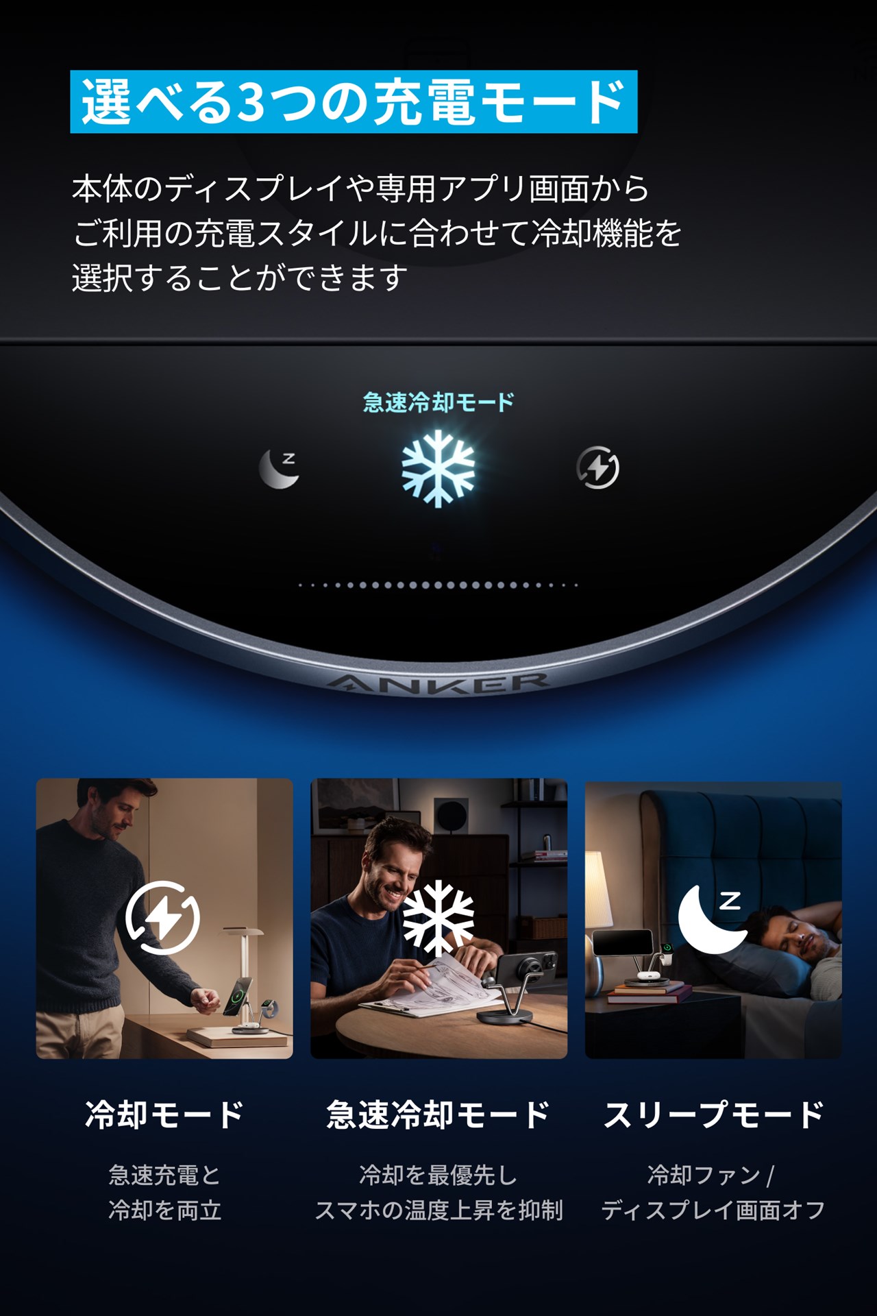 「Anker Prime Wireless Charging Station(3-in-1、MagGo、AirCool、Dock Stand)」は、新規格Qi2 25W出力に対応した3-in-1充電ステーション。価格は2万4990円、発売日は本日11日。
