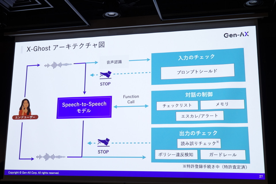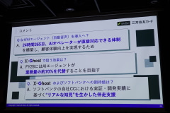 「X-Ghost」は、AIが自律的に思考して自然な音声対話で顧客対応ができる“AIオペレーター”。24時間365日で対応でき、モニタリングAIが発話やシステム挙動をリアルタイムに監視し、リスク判定などを行う。