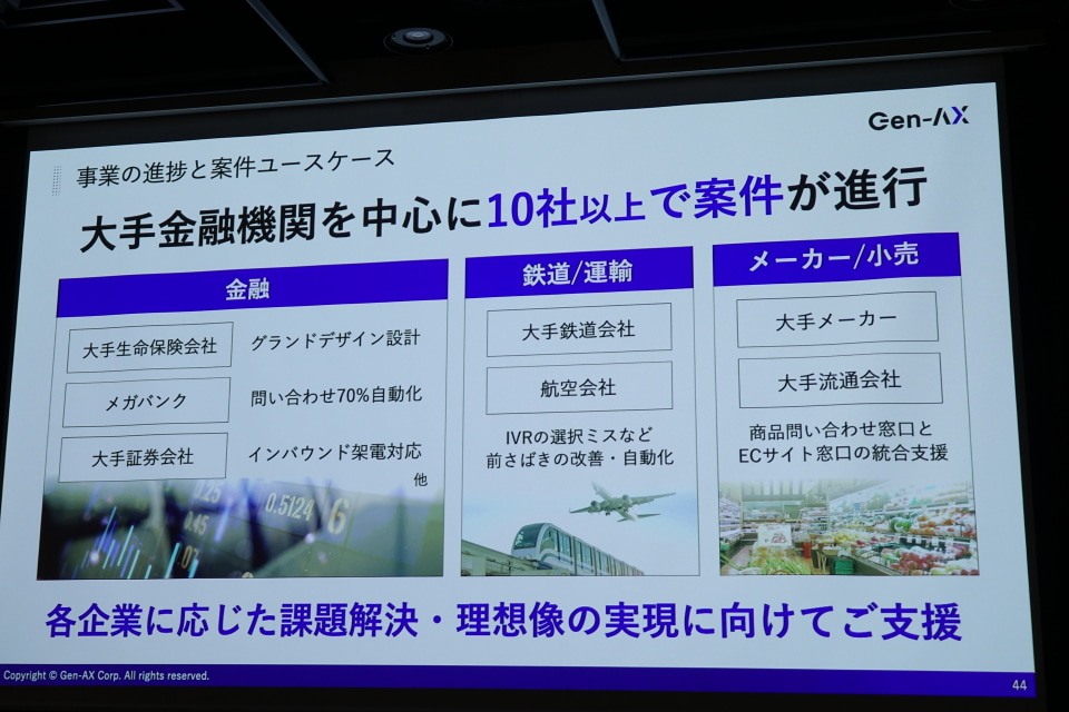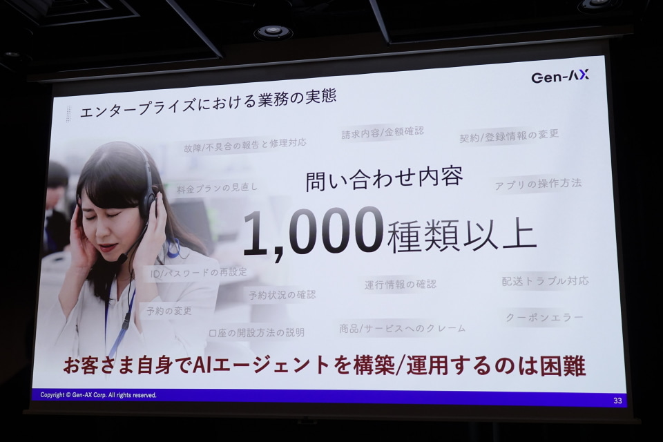 さらに、コールセンターで抱える多数の業務に対してユーザー企業自身でAIエージェントを構築・運用することはハードルが高いことから、Gen-AXがJDSCやシグマクシスなどとともに、導入設計から運用改善までを支援する。