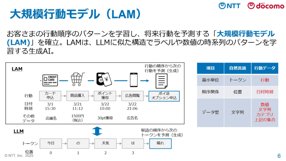 LAMは、大規模言語モデル(LLM)に類似した構造を持つラベルや数値に特化した生成AI基盤。NTTはこのLAMの研究とチューニング(学習)手法の開発を担い、ドコモは、ユーザーデータの統合とLAMの構築、販促時の効果検証を担当した。