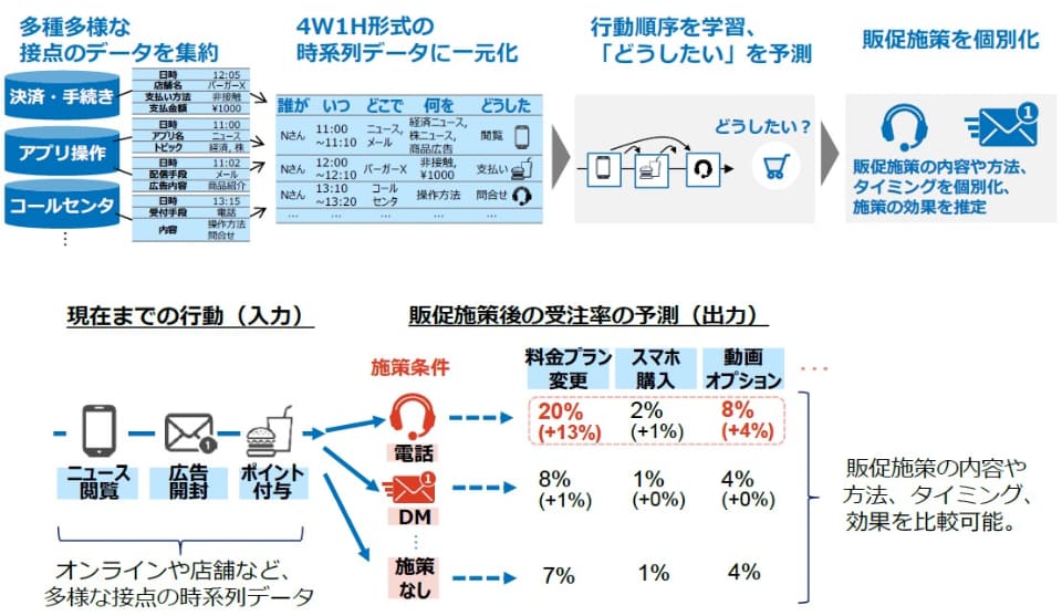 具体的には、決済や手続き、アプリの操作などさまざまなユーザー接点のデータを集約し、誰が、いつ、どこで、何を、どうしたか、という“4W1H”形式の時系列データにまとめる。その後、行動順序を学習し、次にユーザーがどうしたいかを予測し、販促施策を個別化する。たとえば、ユーザーそれぞれに効果的な販促内容や方法、タイミングと予測効果を比較できるほか、どのユーザーから販促すると効果的かを比較できる。