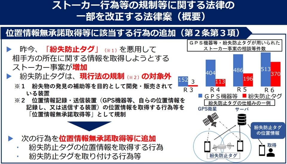 ニュース紛失防止タグの悪用防ぐ、ストーカー規制法改正へ 関口 聖2025年11月11日 14:08 警察庁による「ストーカー行為等の規制等に関する法」の改正案が閣議決定された。 警察庁の資料 警察庁の資料によれば、紛失防止タグを用いて、他人の居場所を探ろうとするストーカーに関する相談件数が増えてきている。2021年(令和3年)の3件に対し、2022年(令和4年)は113件、2023年(令和5年)は196件、2024年(令和6年)は370件に及ぶ。 現行のストーカー規制法では、紛失防止タグは規制の対象外。今回の改正案では、承諾を得ずに現在地を取得する行為や無断で取り付ける行為が規制されることになった。
