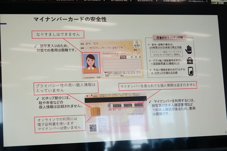 一方、税の情報などプライバシー性の高い情報は、オンライン上のシステムで保存されており、マイナンバーカードの証明書情報を鍵として、オンライン上のシステムから情報を取り寄せている。万が一、マイナンバーカードを紛失した場合でも、ICチップにはこれらの情報が書き込まれていないため引き出せない。ICチップ自体も、暗証番号を一定回数以上間違うと利用できなくなったり、無理矢理データを引き出そうとすると壊れたりする仕組みを導入しており、情報を抜き出すことは困難だという。