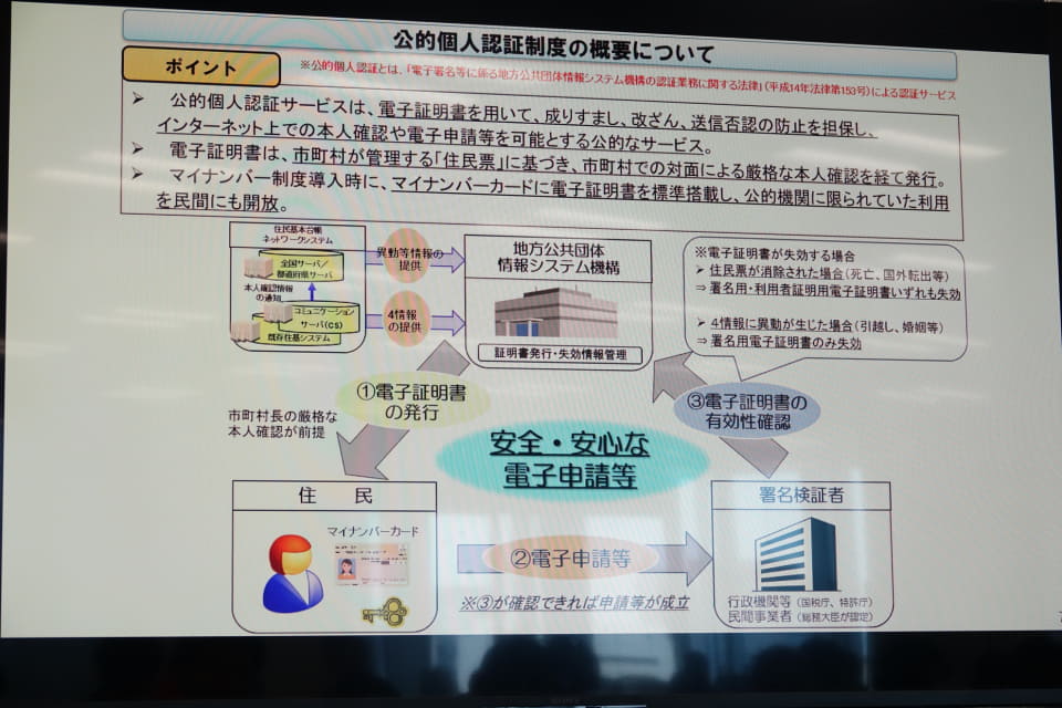 これらの電子証明書は、地方公共団体情報システム機構に、その都度、有効性を確認してはじめて有効になる。たとえば、マイナンバーカードが失効していたり、電子証明書の有効期限が過ぎていたりしていた場合には、証明が無効になり申請が成立しない。