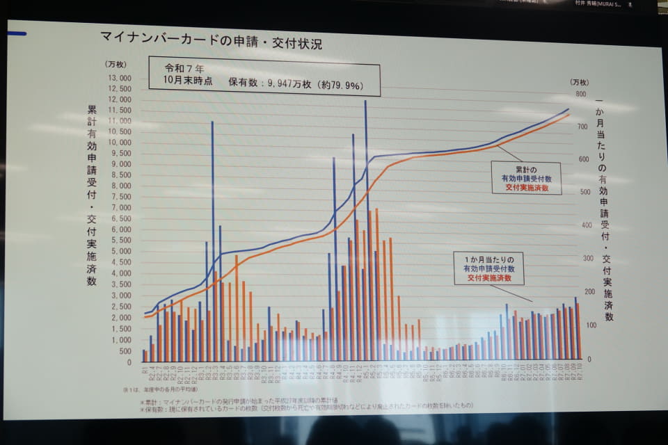 マイナンバーカード保有率は、10月末時点で9947万枚で、これは国民全体の約79.9%にあたる数字になる。マイナポイント(マイナンバーカードの発行などでポイントを進呈する施策)などで保有数は伸びてきており、1カ月あたりの申請受付数や交付件数は近年になり再び上昇傾向となっている。