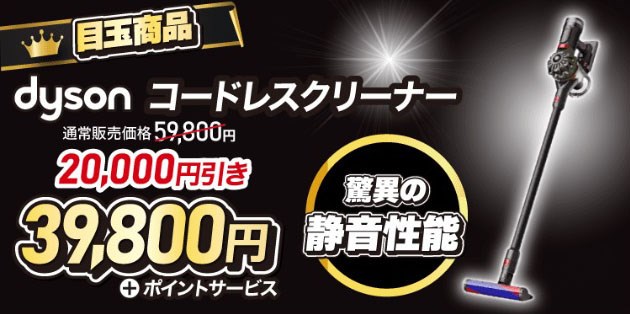 「ビックカメラのブラックフライデー」では、ダイソンのコードレスクリーナー「Dyson Cyclone DS20」が通常価格5万9800円→3万9800円、「ひつじのいらない枕 Fit」が1点で1万3800円、2点同時購入で2万3800円。