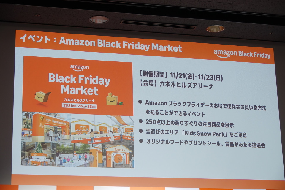 Amazon ブラックフライデーの開催に先駆けて、11月21日~23日の期間、東京都の六本木ヒルズアリーナでは「Amazon Black Friday Market」が開催される。Amazon ブラックフライデーでの便利な買い物方法や注目商品の展示、オリジナルフードなどが当たる抽選会のほか、人工雪を用いた雪遊びエリア「Kids Snow Park」を楽しめる。