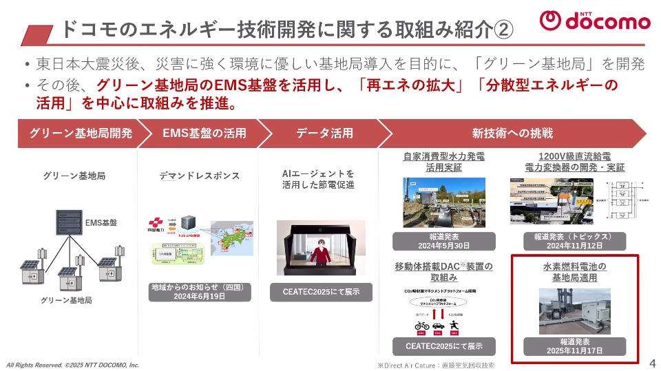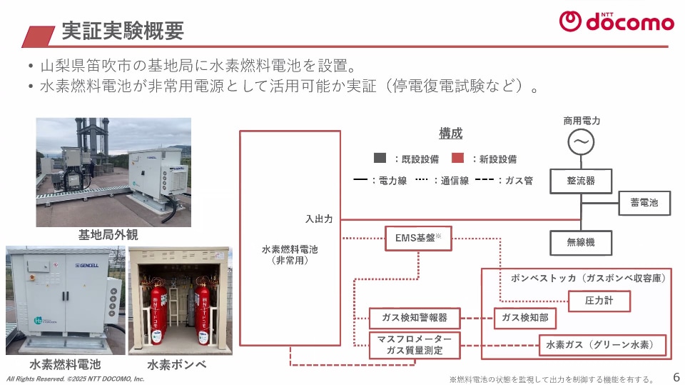 NTTドコモは、水素燃料電池を携帯電話基地局の非常用電源として運用する実証実験を開始した。期間は2025年11月17日~2027年3月31日。