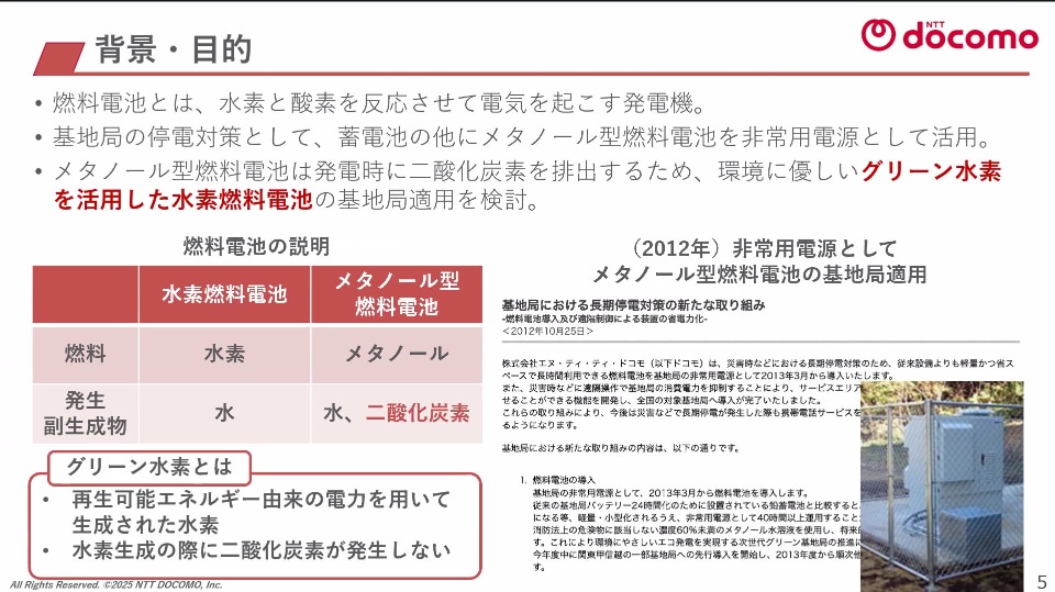 ドコモはこれまで、災害時などの長時間停電対策として、蓄電池に加え、メタノールを燃料とする燃料電池を導入してきた。しかし、メタノール型は発電時に二酸化炭素(CO2)を排出するため、環境負荷の低い代替手段が求められていた。