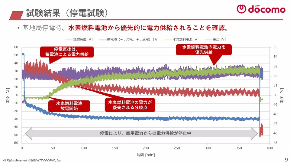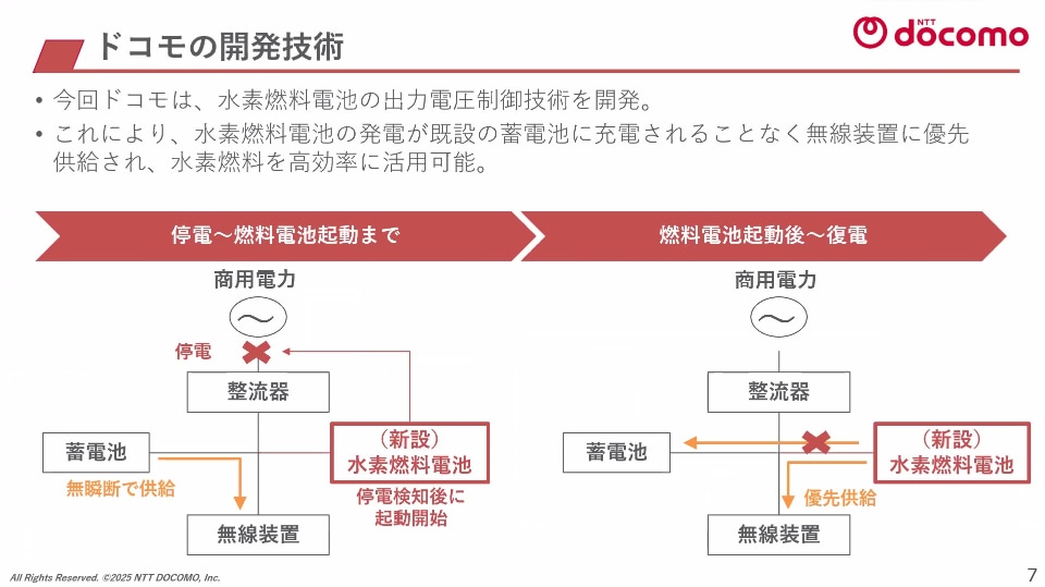 一方、水素燃料電池は、発電時に水のみを排出し、CO2を出さないのが特徴だ。本実験の核となるのは、ドコモが独自に開発した「出力電圧制御技術」になるという。