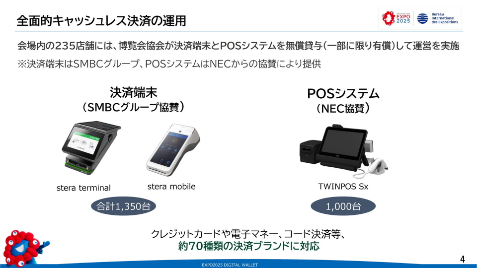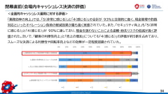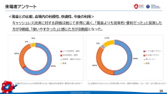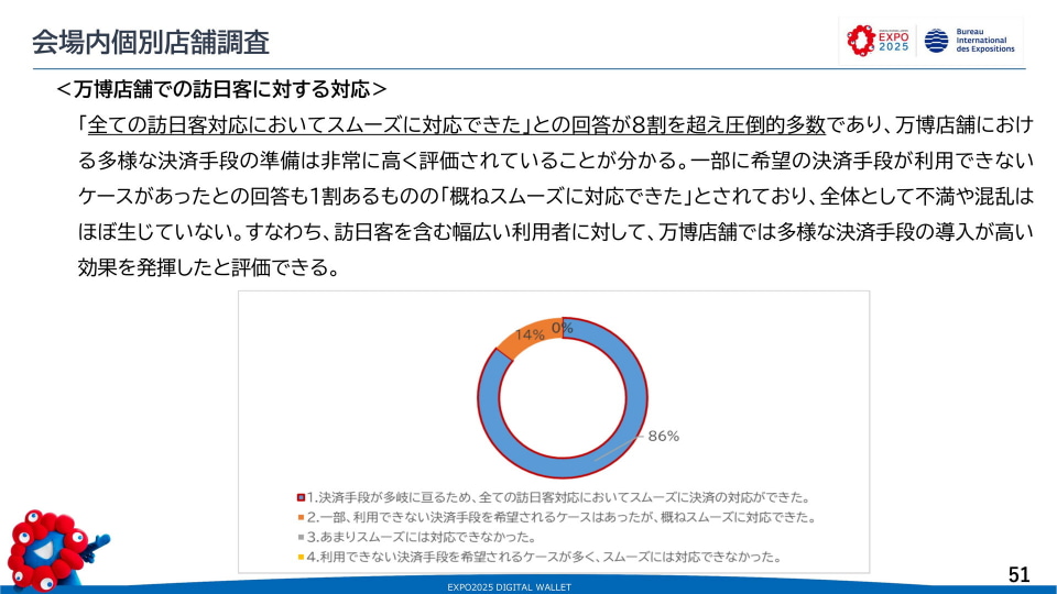 万博会場内では、アンケートに回答した39店舗の85%が万博運営のキャッシュレス決済に関するサポートにおおむね問題はなかったと回答した。一方で店舗向けのサポートセンターで、十分なトレーニング時間をとれずスムーズな対応が一部でできなかったことなどが反省点だとした。