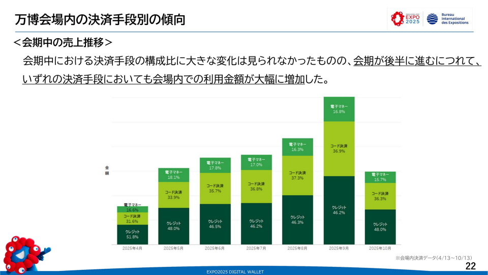 会期が進み、来場者数が増えるに従って利用額も増加したが、決済手段全体の構成比に大きな変化はなかった。独自の電子マネー「ミャクペ!」単体での利用者は現時点では集計中で、後日公開される予定となる。