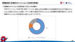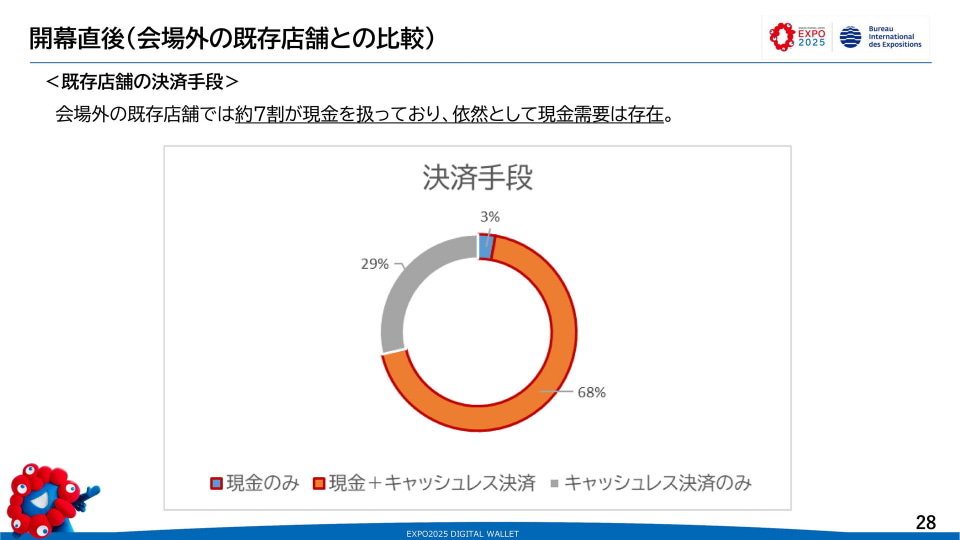 事業者側でのキャッシュレス決済普及にも期待がかかる。大阪・関西万博に出店した店舗のうち、会場外での既存店舗で現金を取り扱っているのは7割ほどに上る。現金のみという店舗は3%に留まる。