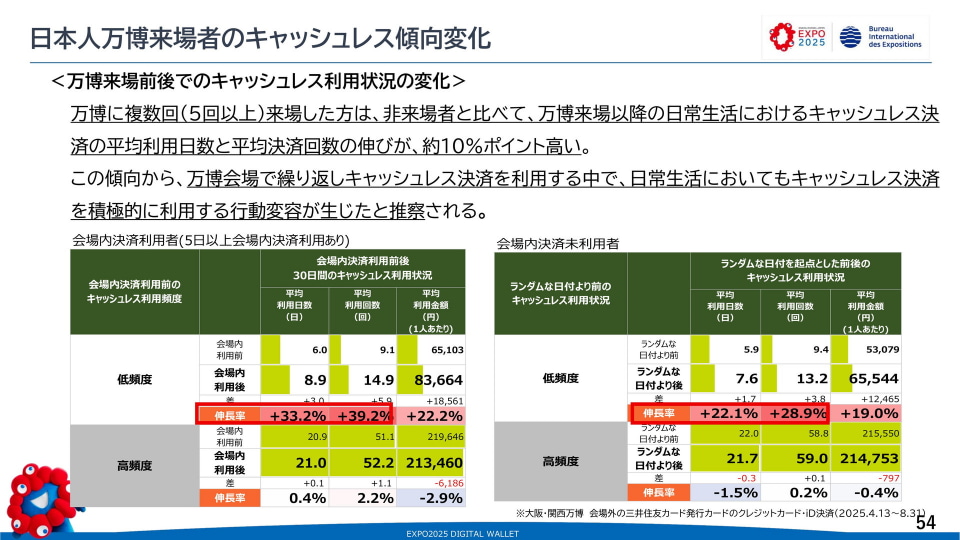大阪府在住者のキャッシュレス決済比率は、東京都と比較して2.5~5.0ポイント高い。万博以外にもVisaのタッチ決済キャンペーン、鉄道のクレジットカードのタッチ決済対応なども開催されており、キャッシュレス決済促進の動きがある。万博が大阪近郊の人々の行動に影響を与えた可能性もあるとされた。