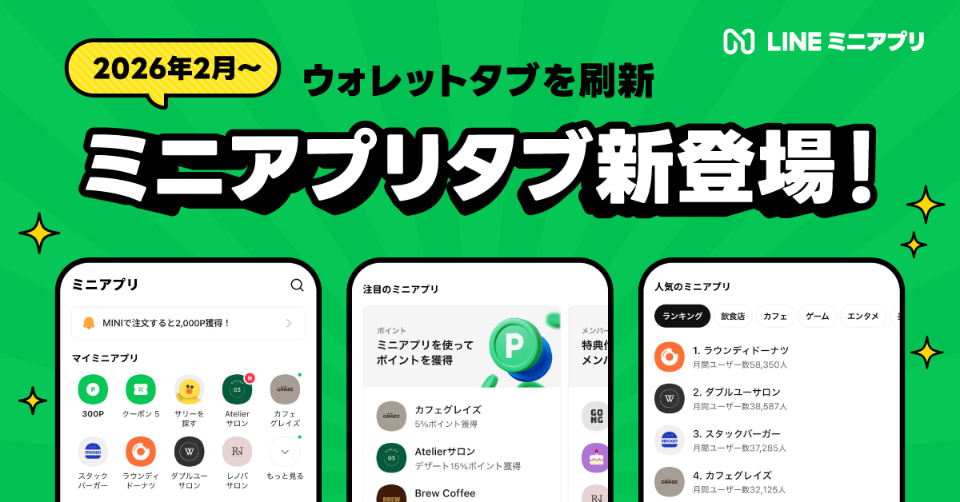 LINEヤフーは、コミュニケーションアプリ「LINE」内の「ウォレットタブ」を、2026年2月頃より順次「ミニアプリタブ」へ刷新する。