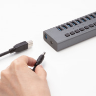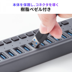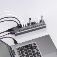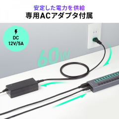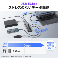 USB 3.2 Gen 1(5Gbps)に対応したUSB Type-Aポートを13基搭載する。電源は、付属のACアダプターを使用し、HDDなどの消費電力が大きい機器を複数接続しても安定して動作する。