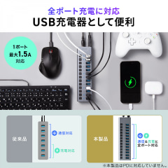 すべてのポートがデータ通信と充電の両方に対応しており、1ポートあたり最大1.5Aの出力が可能。なお、USB Power Delivery(PD)には対応しない。