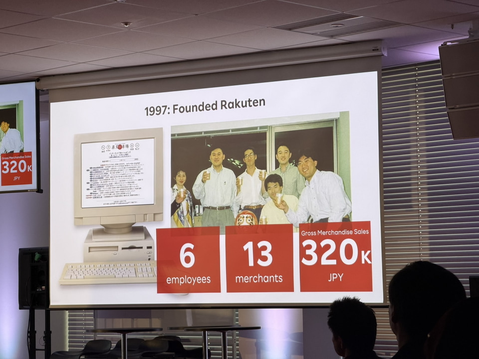 次に楽天の創業時から現在までを振り返った。従業員6人、13店舗で「楽天市場」を始めた1997年はインターネットバブルでIT業界の景気が良かった時期だが、「インターネットで人は買い物などしない、インターネットビジネスは生き残れない」と言われていた。データ通信速度14.4kbpsと低速で、しかも間もなくバブルは弾けてしまった。