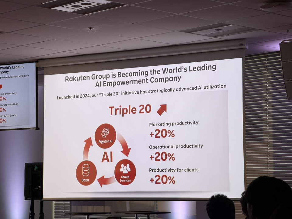 楽天においては、2024年に「トリプル20プロジェクト」を打ち出した。AIを使って、マーケティング効率、オペレーション効率、クライアント効率をそれぞれ20%上げることを目標にしているが、三木谷氏は「トリプル20では十分ではないかもしれない」と語っていた。そこで重要になるのは、データ、実行、AI人材の雇用だという。