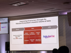 楽天グループには70以上のサービスがあり、楽天カードや楽天ペイ、楽天Edyを使った購買データ、検索ログがある。それに加えてアプリや楽天モバイルの位置情報データもある。それらの情報を使いつつ、独自のLLM(大規模言語モデル)と外部のLLMを組み合わせて「賢いRakuten AI」にしているという。