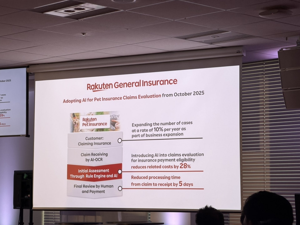 「実行」の例として、楽天グループ内でRakuten AIを使っているユースケースを紹介した。1つは楽天ペット保険。AIを活用して、28%のコスト削減を実現し、支払い処理時間を大幅に短縮したという。