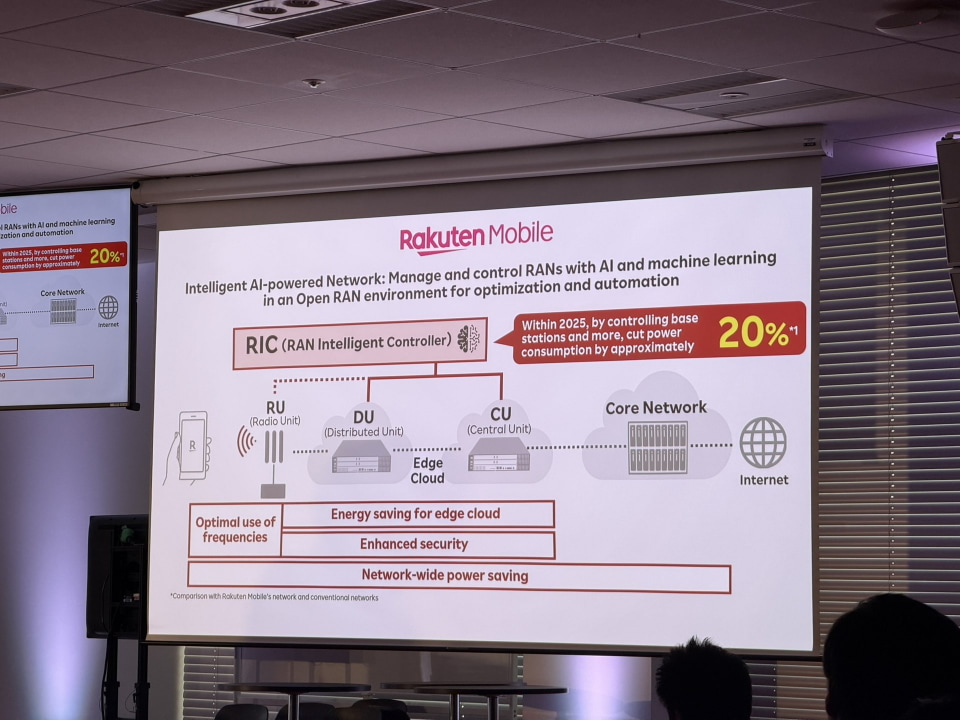 楽天モバイルでは、AIによってRANを管理・制御する「RAN Intelligent Controller(RIC)」導入。これによってネットワーク消費電力を20%削減した。