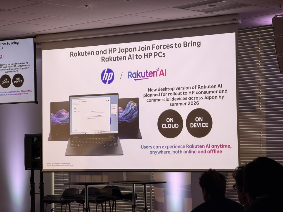 11月11日に発表されたHPとの提携についても紹介した。Rakuten AIのデスクトップ版が、HPが日本全国で販売するパソコンに導入される。オンデバイスAIにより、オフラインでもオンラインでも利用できる。こちらは2026年から、HPの個人、法人向けのパソコンにプリバンドルされた状態で販売される。