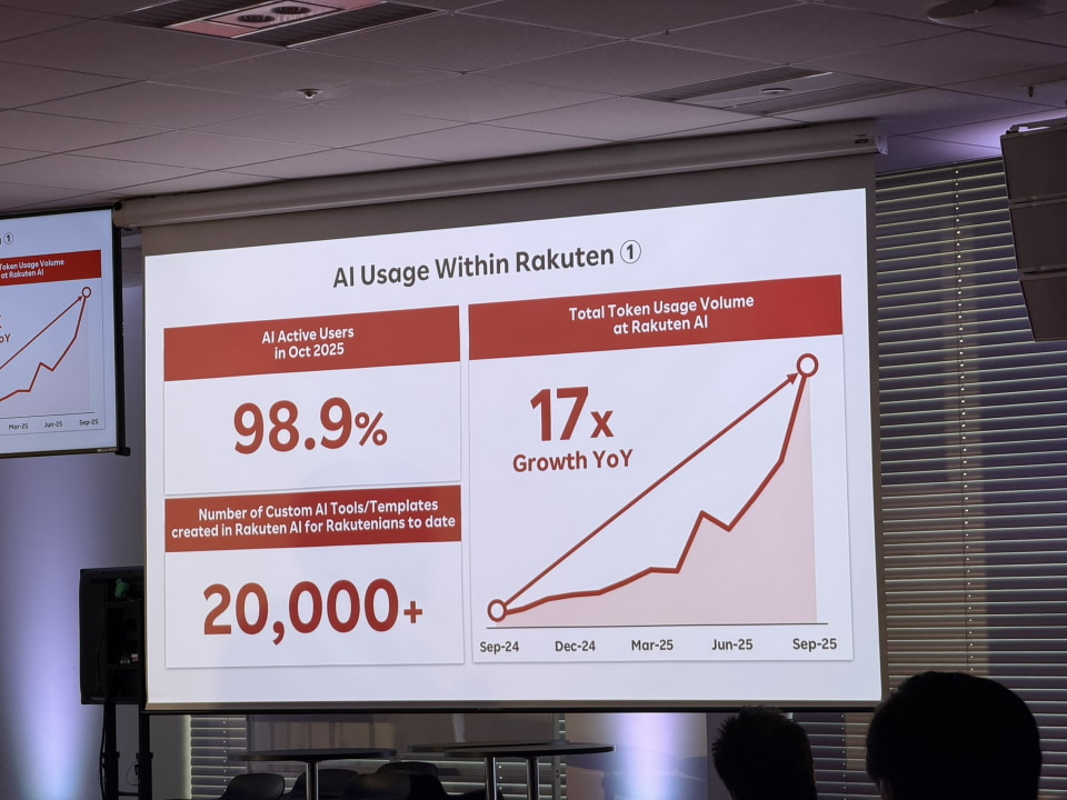 楽天従業員の98.9%が、ほぼ毎日AIを使い、2万以上のAIテンプレートを作成。使われたトークンの量は、昨年からほぼ17倍に増えたという。